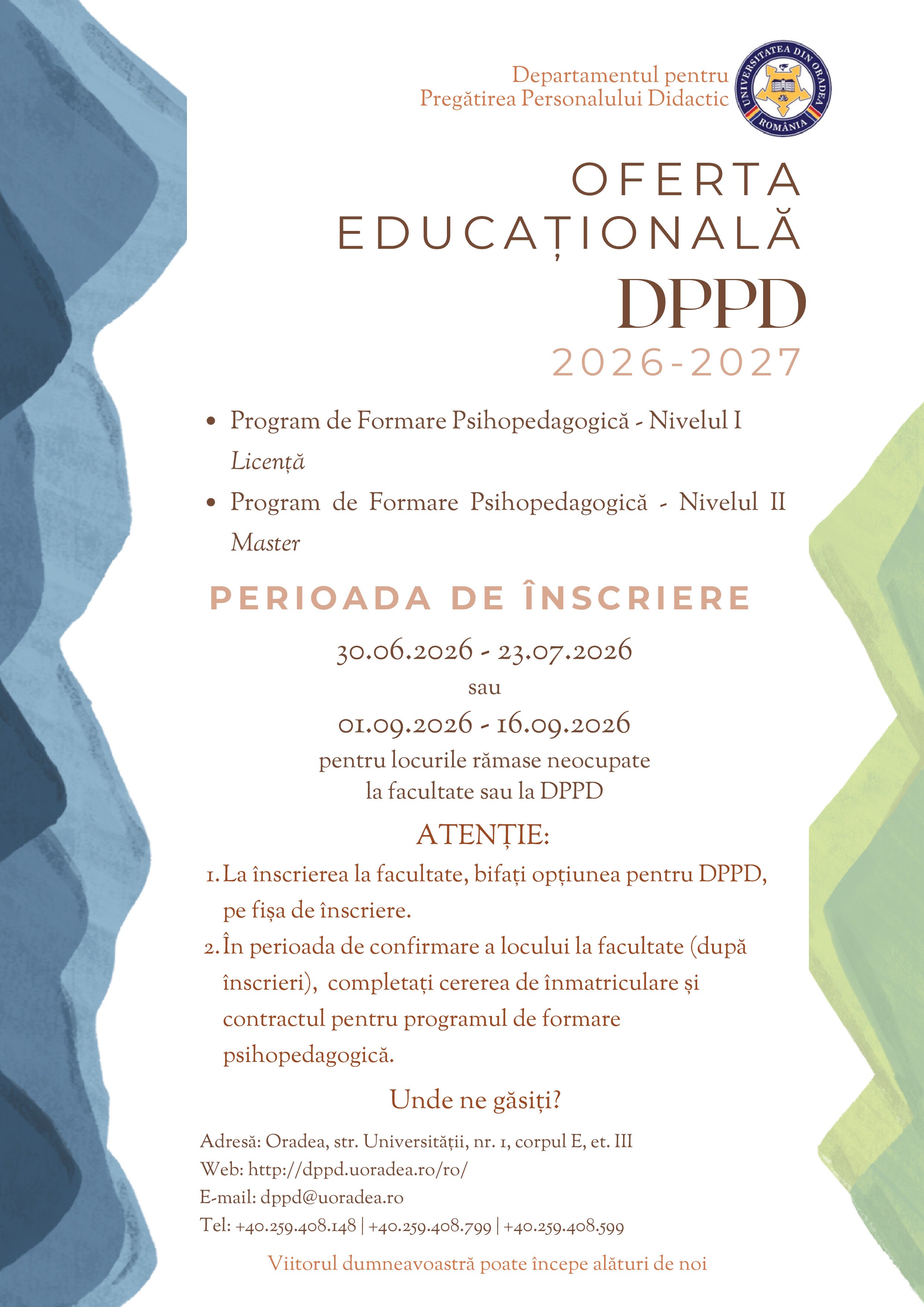 La secțiunile ADMITERE / PROGRAME DE FORMARE găsiți informații privind înscrierea la programele de formare psihopedagogică în cadrul D.P.P.D. - Universitatea din Oradea
